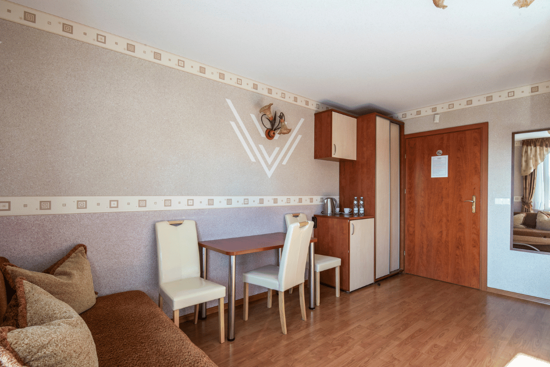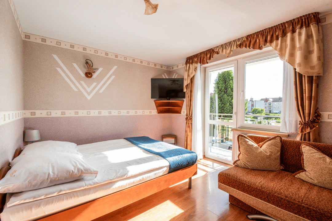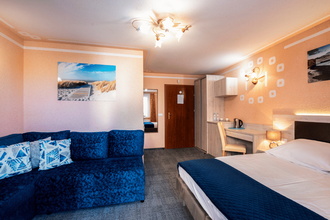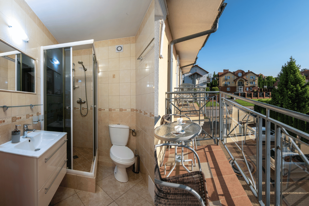 Pokój trzyosobowy premium w Villa Dora to idealne miejsce na relaks. Znajdziesz tu wygodne łóżka,( łoże małżeńskie + kanapa), prywatną łazienkę z przestronnym prysznicem i suszarką do włosów. Pokój wyposażony jest w telewizor z płaskim ekranem, lodówkę, czajnik oraz zestaw do parzenia kawy i herbaty. Dzięki balkonowi, możesz cieszyć się pełną swobodą i pięknymi widokami. Na zewnątrz czekają na Ciebie meble ogrodowe, idealne do relaksu na świeżym powietrzu.